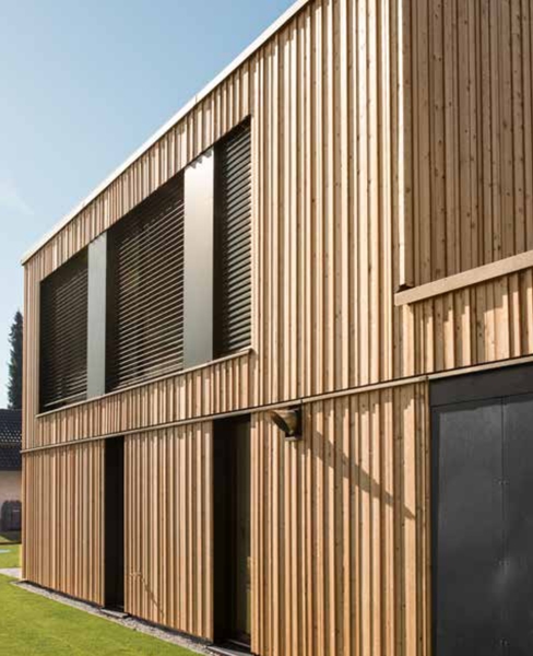 Skyline, to je individualita. Žádné dvě fasády nejsou stejné. Navíc vzhled té které fasády se jeví jako odlišný v závislosti na úhlu pohledu. Jedná se o výjimečně moderní pojetí dřevěné fasády, což umožňuje všem, od architekta až po zákazníka, být kreativnější.